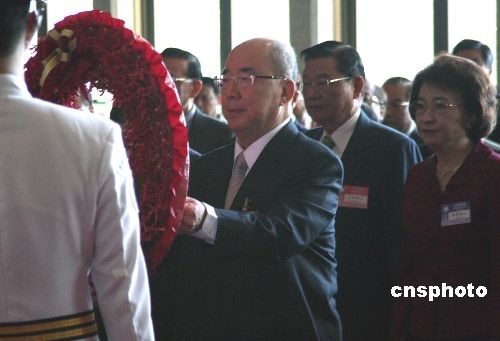 11月22日,中國國民黨第十七次全代會臨時會議在臺北“國父紀念館”舉行。圖為會議前,國民黨主席吳伯雄率黨內同仁在紀念館內向中山先生銅像獻花致敬。中新社發(fā) 劉舒凌 攝