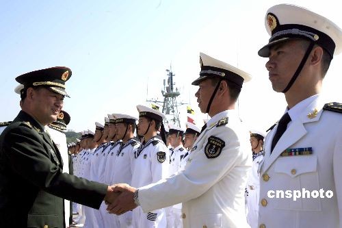 中午十二時(shí),海軍772導(dǎo)彈護(hù)衛(wèi)艇編隊(duì)駛?cè)腭v港海軍基地昂船洲碼頭,接替即將輪換出港的770導(dǎo)彈護(hù)衛(wèi)艇編隊(duì)。圖為駐港部隊(duì)副司令員王郡里少將與海軍官兵握手致意。
