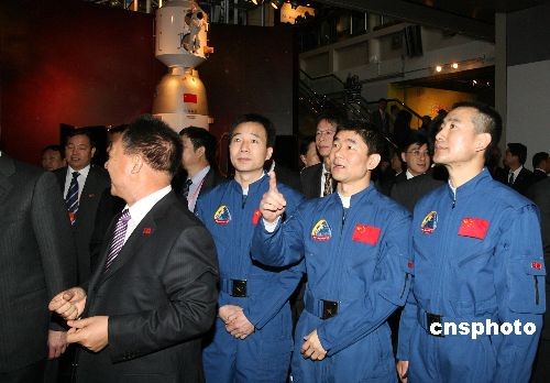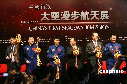 十二月六日,“中國首次太空漫步航天展”在香港科學(xué)館揭幕,神舟七號(hào)返回艙、航天服和航天員出艙后所展示的國旗等珍貴展品和圖片在展會(huì)上亮相。香港特區(qū)政府政務(wù)司司長唐英年、神舟七號(hào)載人航天飛行赴港代表團(tuán)團(tuán)長暨中國載人航天工程副總指揮張建啟、神七航天員翟志剛、劉伯明、景海鵬等出席揭幕儀式。中新社發(fā) 武仲林 攝