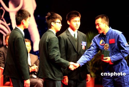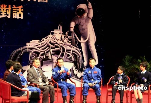 十二月八日,神舟七號載人航天飛行代表團在香港灣仔伊利沙伯體育館與香港學(xué)生真情對話。中新社發(fā) 張勤 攝
