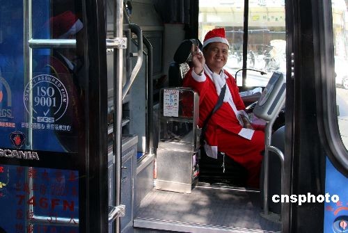 圣誕節(jié)將至,臺北市有的客車司機(jī)穿上了圣誕老人的服飾,以活躍氣氛。圖為12月20日,一輛長途客車的司機(jī)正準(zhǔn)備載客出發(fā)。中新社發(fā) 陳立宇 攝