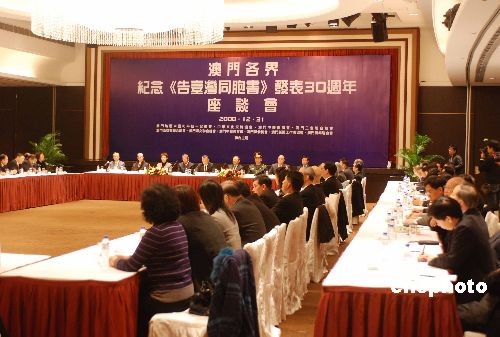 “澳門各界紀(jì)念《告臺灣同胞書》發(fā)表三十周年座談會” 十二月三十一日下午舉行,澳門特區(qū)行政長官何厚鏵、中央駐澳聯(lián)絡(luò)辦主任白志健等嘉賓及澳門各界代表一百余人出席。中新社發(fā) 畢永光 攝