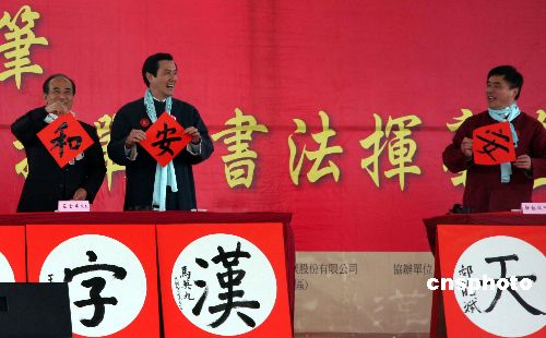 臺北市政府主辦的第五屆“漢字文化節(jié)”于二〇〇九年的第一天在臺北中央藝文公園舉行,吸引了一萬二千多民眾共揮毫迎新年。圖為臺灣地區(qū)領(lǐng)導人馬英九,臺灣立法機構(gòu)負責人王金平和臺北市長郝龍斌等各界人士共同揮毫為新年祈福。中新社發(fā) 路梅 攝