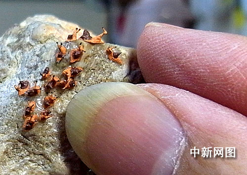 圖為臺(tái)灣著名微雕家陳逢顯創(chuàng)作的世界最小“蝸!比,每只蝸牛的殼、觸角、眼睛兼具,有形有神。中新社記者 陳立宇 攝