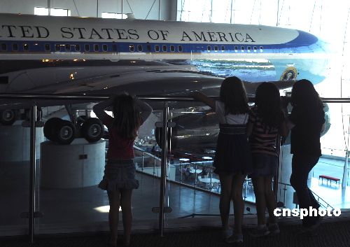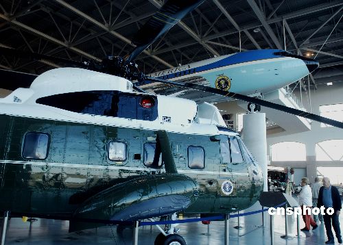 美國(guó)民眾十一月十九日參觀洛杉磯的里根總統(tǒng)博物館,大廳里展示當(dāng)年三任總統(tǒng)乘坐過的空軍一號(hào)專機(jī)和海軍一號(hào)直升機(jī)。中新社發(fā) 賈國(guó)榮 攝