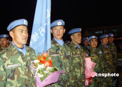 二十三日晚間二十一時(shí)許,中國赴蘇丹達(dá)爾富爾維和工兵先遣分隊(duì)一百三十五名官兵,在鄭州新鄭國際機(jī)場乘南航包機(jī)啟程,前往非洲。圖為啟程前,維和官兵同中外記者見面,并接受采訪。中新社發(fā) 李志全 攝