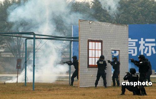 十二月二十八日,廣東佛山公安特警、武警舉行技戰(zhàn)演練,在反劫持人質綜合演練中,佛山特警為了解救被“劫持”的5名國家重點項目科技人員,在反恐指揮部的指令下,地面攻擊組、車輛突擊組、垂降組、情報組、爆破組、談判組迅速到達指定位置待命,然后以迅雷不及掩耳之勢發(fā)起立體攻擊,瞬間將恐怖分子擊斃,安全解救人質。中新社發(fā) 孫建駒 攝