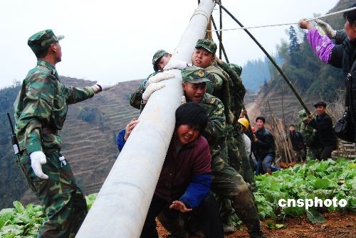 圖:中國廣西駐軍幫助冰凍災(zāi)區(qū)搶修電力設(shè)備