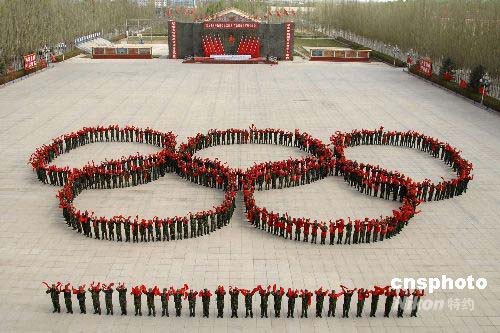 2008年5月8日,奧運(yùn)火炬成功完成珠峰傳遞的消息傳來,即將執(zhí)行青藏線運(yùn)輸任務(wù)的解放軍總后勤部青藏兵站部某汽車團(tuán)官兵組成“五環(huán)”標(biāo)志,慶祝奧運(yùn)夢(mèng)想首次登上世界第三極。中新社發(fā) 吳蘇琳 攝