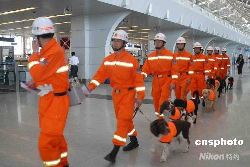 5月13日,沈陽(yáng)市消防支隊(duì)30名特勤官兵帶著10條消防搜救犬,乘專機(jī)火速奔赴四川地震災(zāi)區(qū),全力參加抗震救災(zāi)。 圖為出發(fā)前的特勤官兵和搜救犬。中新社發(fā) 王忠喜 攝