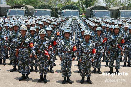 5月14日13時,中國南海艦隊(duì)海軍陸戰(zhàn)隊(duì)某旅搶險救災(zāi)部隊(duì)第一梯隊(duì)760名官兵緊急起程奔赴四川汶川地震災(zāi)區(qū)。第一梯隊(duì)的760人采取摩步化機(jī)動方式行進(jìn),預(yù)計48小時后抵達(dá)汶川災(zāi)區(qū)。中國南海艦隊(duì)海軍陸戰(zhàn)隊(duì)將累計出動官兵2500名。中新社發(fā) 李唐 攝