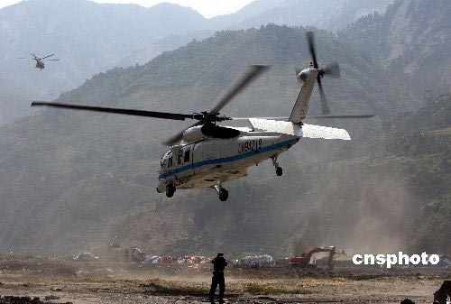 5月19日,中國空軍繼續(xù)高密度對四川省汶川大地震核心重災(zāi)區(qū)映秀鎮(zhèn)空運救災(zāi)物資與部隊急需的飲用水等給養(yǎng)。雖然都江堰至映秀的“生命線公路”已經(jīng)打通,但是不斷的余震與降雨每天都會多次中斷車輛通行。中新社發(fā) 任晨鳴 攝