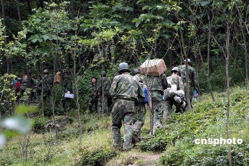 5月18日,中共中央總書記胡錦濤在北川視察災(zāi)情時(shí),聽(tīng)說(shuō)鎣華鎮(zhèn)北門村麻柳坪道路至今沒(méi)有打通,災(zāi)民生活十分困難,當(dāng)即要求空軍派兵支援。中國(guó)空軍125名空降兵精干小分隊(duì)帶著食物、藥品徙步32公里,冒著不斷發(fā)生的余震、通過(guò)37處滑波,第一個(gè)進(jìn)入海拔1200多米的麻柳坪。圖為空降兵首批小分隊(duì)扛著藥品食物、冒著高溫向麻柳坪開進(jìn)的情景。中新社發(fā) 譚超 攝