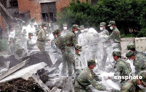 5月20日,濟南軍區(qū)某機步旅十二連官兵冒著中毒的危險,幫助四川省彭州市新科油化助劑有限公司緊急轉(zhuǎn)移增粘劑、阻燃劑等55噸有微毒的化學原料。官兵們在震塌的廢墟中仔細尋找、快速搶運,把散落的化工原料用袋子裝起來,為災區(qū)挽回了300多萬元的損失。圖為官兵們搶運時的情景。中新社發(fā) 施文標 攝