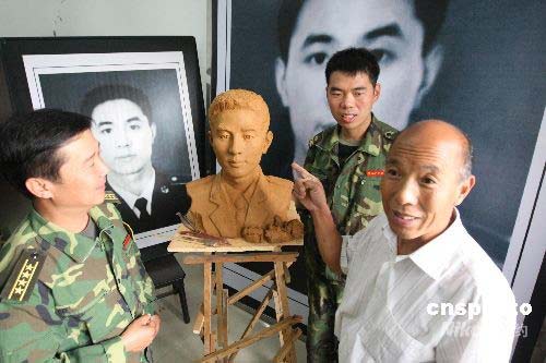 7月11日,抗震救災(zāi)烈士武文斌的父親武忠林來到四川都江堰市玉堂鎮(zhèn)鐵軍駐地,看到武文斌生前戰(zhàn)友為兒子創(chuàng)作的塑像時(shí),連聲贊嘆到“真象!真象!”。武文斌烈士因勞累過度犧牲在抗震救災(zāi)一線后,在該部享有“泥人張”之稱士官張厚嶺(右二)便有了為英雄塑像的想法。中新社發(fā) 曾憲平 攝