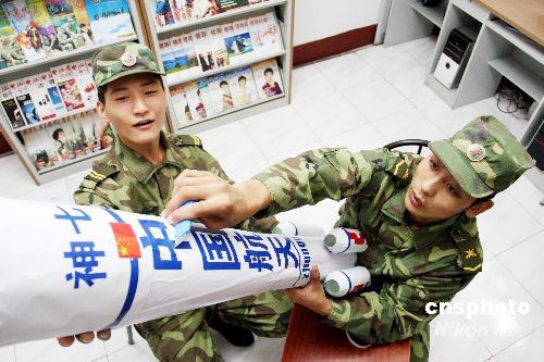 9月23日,濟南軍區(qū)某部,一級士官馬迪正在展示自己制作的“神七”載人飛船模型。得知“神七”載人飛船即將發(fā)射的消息后,他利用收集的廢棄易拉罐、可樂瓶,動手創(chuàng)作了“神七”載人飛船模型,表達對我國航天事業(yè)成果的祝福。中新社發(fā) 梁志杰 攝