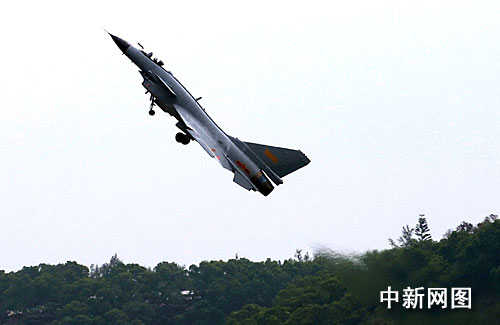 殲十戰(zhàn)機(jī)大仰角起飛。