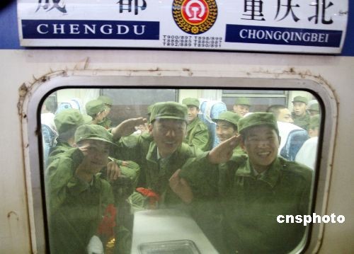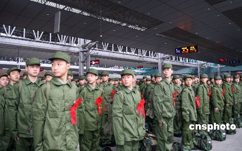 11月19日下午,重慶地區(qū)2008年冬季招兵征召的首批915名進(jìn)藏新兵在重慶火車(chē)北站登上列車(chē),前往成都受訓(xùn)準(zhǔn)備進(jìn)藏服役。據(jù)稱,本次前往西藏服役的新兵8成以上達(dá)到高中以上文化程度,平均年齡為19歲,來(lái)自重慶大足、璧山、渝北等17個(gè)區(qū)縣。中新社發(fā) 郭晉嘉 攝