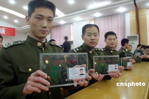 2009年2月26日,濟(jì)南警備區(qū)、濟(jì)南市公安局聯(lián)合舉行駐濟(jì)部隊(duì)現(xiàn)役軍人居民身份證首發(fā)儀式。自此,濟(jì)南市為駐濟(jì)部隊(duì)申領(lǐng)發(fā)放具名身份證工作正式啟動(dòng)。此舉將對(duì)部隊(duì)人員辦理儲(chǔ)蓄、保險(xiǎn)、買車、購(gòu)房等涉及個(gè)人權(quán)益事物時(shí)帶來(lái)便捷。中新社發(fā) 龔輝 攝