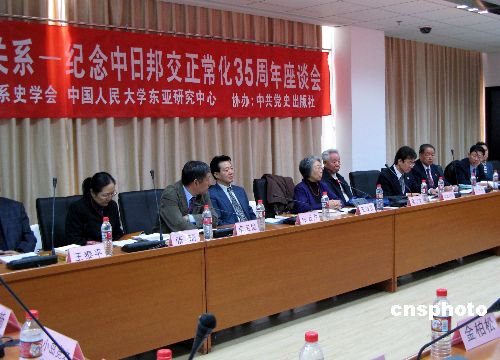10月18日,“廖承志與中日關(guān)系——紀(jì)念中日邦交正常化35周年座談會”在北京中國人民大學(xué)舉行。該座談會由中國中日關(guān)系學(xué)會、中國人民大學(xué)東亞研究中心共同舉辦,與會的有中日友好協(xié)會副會長王效賢、日本駐華大使館公使道上尚史、以及幾十位專家學(xué)者、相關(guān)人士。大家在緬懷廖承志先生的同時,對中日關(guān)系的發(fā)展紛紛發(fā)表了自己的見解,氣氛凝重而又不失建設(shè)性。據(jù)悉,這次座談會的舉行源自新近由中共黨史出版社出版的一本新書,書名為《廖承志與日本》。作者是原新華社駐東京首席記者吳學(xué)文先生和時事出版社編審?fù)蹩┫壬。中新社發(fā) 單琪 攝