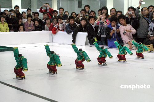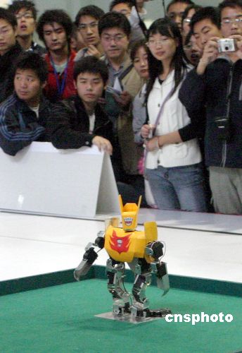 10月26日,為期3天的2007“銀泉杯”中國機器人大賽暨Robo Cup中國公開賽在濟南大學科技園開幕。據(jù)了解,本次大賽共有來自國內(nèi)外的400多支隊伍1000余名選手參賽,大賽設(shè)置了34個比賽項目,包括Robo Cup機器人比賽、FIRA機器人比賽、空中機器人比賽、水中機器人比賽、舞蹈機器人比賽及雙足競步機器人比賽等多種比賽類型,是歷屆中國機器人大賽中比賽種類最多和最全的一次。中新社發(fā) 龔輝 攝