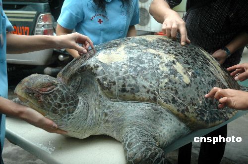 2007年11月1日,海南省小動物保護協(xié)會在?谑袞|海岸海邊救助一只約1米多長、重150公斤左右的國家二級野生保護動物綠海龜,移交給海洋漁業(yè)部門處理。該只罕見的綠海龜由附近居民發(fā)現(xiàn)后并自發(fā)呵護,但救助時已經死亡。海南省漁業(yè)監(jiān)察總隊有關負責人稱,初步估計它至少有100歲以上,身上有多處傷痕,需要解剖才能查明真正死因,有關方面將把它制作成標本展覽,以教育人們保護海龜。中新社發(fā) 善平 攝
