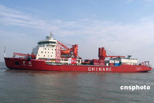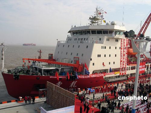 十一月十二日上午十時三十分,首次投入使用的外高橋的中國極地科考船專用碼頭上,彩旗迎風招展。已舊貌換新顏的中國唯一從事極地破冰航行的科考船“雪龍”號身披紅裝從這里啟航奔赴南極,執(zhí)行第二十四次南極科考任務。中新社發(fā) 陸從兵 攝