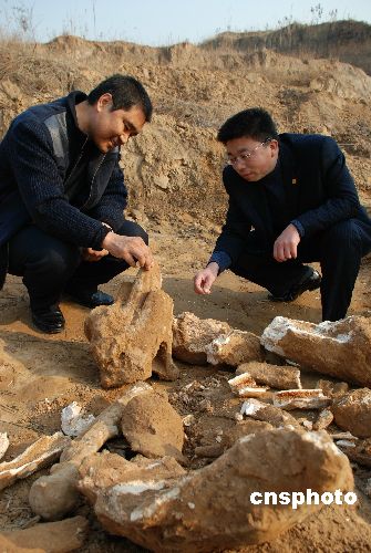 12月5日,山東淄博周村區(qū)王村鎮(zhèn)西道村磚廠(chǎng)挖掘出疑似“恐龍”的巨型動(dòng)物骨骼化石。當(dāng)日10點(diǎn)48分,正在淄博周村區(qū)王村鎮(zhèn)西道村磚廠(chǎng)施工的司機(jī)小郝,給村主任劉道新打電話(huà)說(shuō)“挖掘機(jī)在工作時(shí)挖到了大量的化石,很像是動(dòng)物的骨骼!痹诂F(xiàn)場(chǎng)進(jìn)行保護(hù)的彭陽(yáng)派出所的所長(zhǎng)于成杰介紹說(shuō),這次挖到的化石很大,露出來(lái)的化石有6米多長(zhǎng),呈圓柱狀細(xì)端的直徑有18-19厘米,粗端的直徑有30-40厘米。其動(dòng)物骨格的特征非常明顯,其體積顯然比大象要大的多,與史前動(dòng)物“恐龍”骨骼化石極其相似。中新社發(fā) 梁寶海 攝
