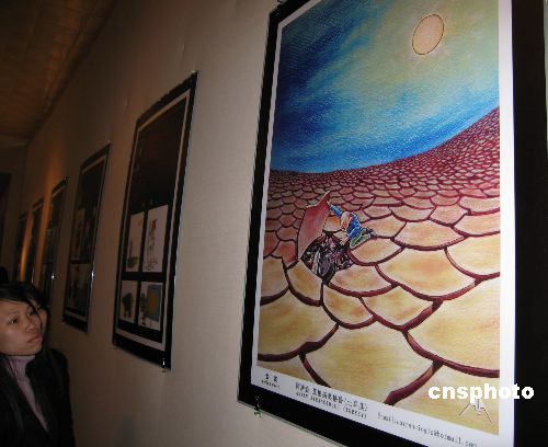 一月七日,二00七中國·廣西城市職業(yè)學(xué)院國際漫畫大賽獲獎(jiǎng)作品在廣西南寧展出。此次國際漫畫大賽以環(huán)保為主題,共收到來自全球四十二個(gè)國家的八千多幅作品。圖為觀眾在欣賞獲得金獎(jiǎng)的土耳其漫畫家Askin Ayrancioglu的作品。中新社發(fā) 王剛 攝