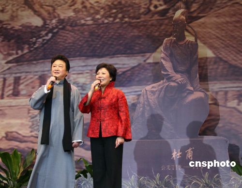 2月13日,中國農歷戌子年正月初七“人日”,在“詩圣”故居成都杜甫草堂詩圣文化園,數千名成都市民和各地游人聚精會神觀賞“人日游草堂”大型文藝演出,感受濃厚的詩情畫意。圖為著名配音表演藝術家喬榛、丁建華現場表演詩歌朗誦。中新社發(fā) 霍潺 攝