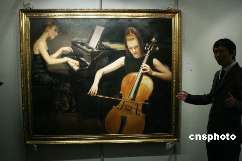 四月五日,中國嘉德二零零八春季拍賣巡展在香港舉行,八十年代陳逸飛音樂題材肖像作品系列之一的《二重奏》估價八百萬至一千萬元人民幣。中新社發(fā) 武仲林 攝