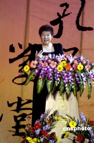 2008年4月5日晚,著名學者、北京師范大學教授于丹來到山東曲阜,作為剛剛開設(shè)的“孔子學堂”首位主講人登上杏壇的講臺!翱鬃訉W堂”是曲阜市與中華書局面向廣大普通游客和公眾開設(shè)的文化大型講座。今后每年的4月到10月,每月都將邀請一名專家主講,一名專家現(xiàn)場點評,通過和聽眾的問答互動,旨在弘揚儒學經(jīng)典文化。中新社發(fā) 張侃 攝