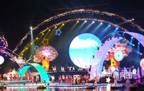 第四屆中國國際動(dòng)漫節(jié)開幕式晚會(huì)現(xiàn)場,晚會(huì)由“心”、“情”、“夢”三個(gè)篇章組成,充分體現(xiàn)了“多彩動(dòng)漫品質(zhì)生活”的主題。 周翌 攝