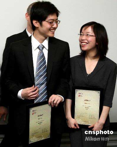 5月7日,清華大學“清華-杜孟傳播獎學金”頒獎典禮上,獲得此項獎勵“最佳創(chuàng)意獎”的清華學生侯青楊(右)、“優(yōu)秀策劃案獎”得主張棟同學,分別獲得赴瑞士日內瓦和泰國曼谷的聯(lián)合國愛滋病規(guī)劃署實習3個月的機會。這兩位清華學生將與世界各地專業(yè)人士一起為解決世界和中國可能發(fā)生的由愛滋病引起的嚴重健康危機而工作。中新社發(fā) 宋吉河 攝
