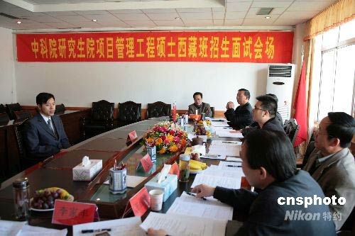 5月8日,中國科學(xué)院研究生院首次西藏研究生班招生在拉薩面試。今天是北京奧運(yùn)圣火勝利登頂珠峰的一天,上午的招生面試也推遲了一個(gè)小時(shí),專家及考生觀看了北京奧運(yùn)圣火勝利登頂珠峰的電視直播。隨后來自西藏各個(gè)行業(yè)的40多名藏漢考生懷著激動(dòng)和喜悅的心情參加了本次面試答辯。中新社發(fā) 扎西朗杰 攝
