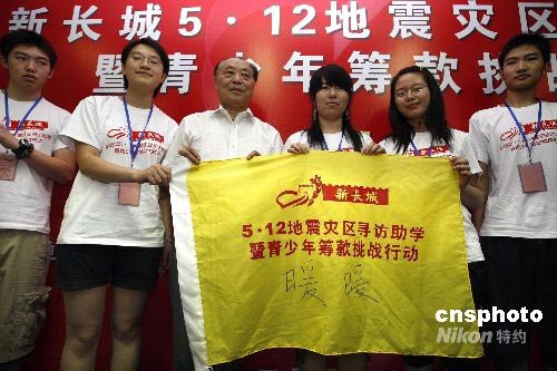 7月6日,中國扶貧基金會(huì)“新長城5.12地震災(zāi)區(qū)尋訪助學(xué)暨青少年籌款挑戰(zhàn)行動(dòng)”在北京舉行;顒(dòng)招募青少年志愿者組成籌款團(tuán)隊(duì),每隊(duì)3人用時(shí)2周挑戰(zhàn)籌款,目標(biāo)1萬元人民幣,善款將作為新長城自強(qiáng)助學(xué)金用于5.12地震災(zāi)區(qū)小學(xué)學(xué)生的生活學(xué)習(xí)費(fèi)用。本次活動(dòng)的主題為“直面災(zāi)難,共同成長”,一方面通過活動(dòng)籌集善款為災(zāi)區(qū)學(xué)生解決經(jīng)濟(jì)困難,另一方面,城市里的青少年通過這次活動(dòng)得到了一次難得的奉獻(xiàn)愛心,挑戰(zhàn)自我的機(jī)會(huì)。此次活動(dòng)的分為網(wǎng)上報(bào)名()和現(xiàn)場報(bào)名(010-62639775)兩種,截止于7月12日。圖為中國扶貧基金會(huì)會(huì)長段應(yīng)碧(左三)為首批志愿者團(tuán)隊(duì)授旗。中新社發(fā) 杜洋 攝