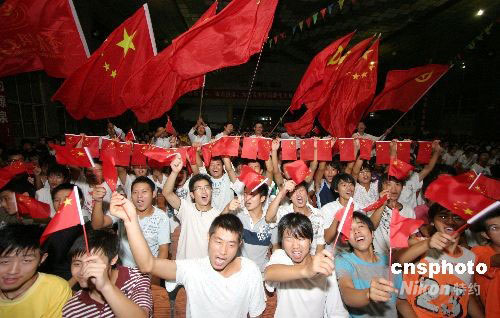 9月25日21時33分,北京航天飛控中心宣布“神七”發(fā)射成功。重慶科創(chuàng)職業(yè)學院大禮堂里觀看電視直播的2000多名學生頓時揮舞著手中的國旗歡呼雀躍。21時10分,搭乘著翟志剛、劉伯明、景海鵬3位航天員的神舟七號飛船在中國酒泉衛(wèi)星發(fā)射中心發(fā)射升空,這是神舟飛船第七次飛入太空,也是中國人第三次登上太空。中新社發(fā) 陳仕川 攝