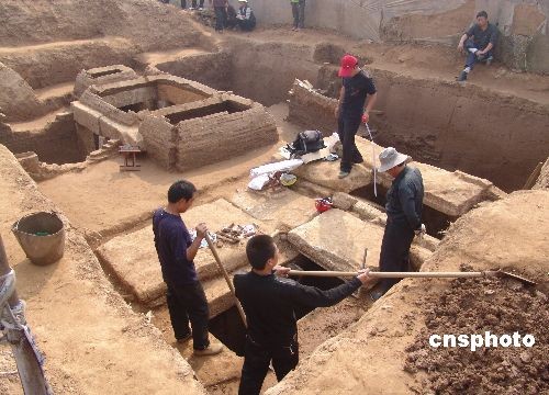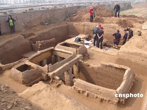 10月15日,考古人員正在挖掘漢墓。近日,在山東省沂南縣磚埠鎮(zhèn)發(fā)現占地約3000平方米的東漢家族墓葬群,經過上級部門批準,考古人員對其中兩座墓穴進行了搶救性科學挖掘,目前已經發(fā)掘出土8件釉陶壺在內的大量文物,墓內石壁上有多幅畫像,清晰可見。中新社發(fā) 杜昱葆 攝