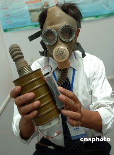 10月16日,由中國(guó)發(fā)明協(xié)會(huì)、發(fā)明者協(xié)會(huì)國(guó)際聯(lián)合會(huì)等共同主辦的“第六屆國(guó)際發(fā)明展覽會(huì)”,在蘇州國(guó)際博覽中心舉行。圖為鹽城市第一中學(xué)教師嚴(yán)海希先生展示自己指導(dǎo)學(xué)生研制的可用于殺病毒、殺病菌的“多功能防毒面具”。中新社發(fā) 鄒憲 攝