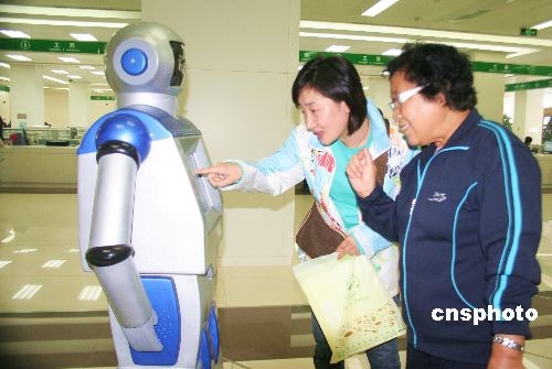 2008年10月22日,機關(guān)機器人首次亮相沈陽,沈陽市行政審批服務(wù)中心工作人員介紹,該機器人能自主行走,自動避障,回答辦事人員諸如問路、辦事程序等提問,它還能自動受理語音投訴,開創(chuàng)了中國政府部門使用智能機器人的先河。中新社發(fā) 劉寶成 攝