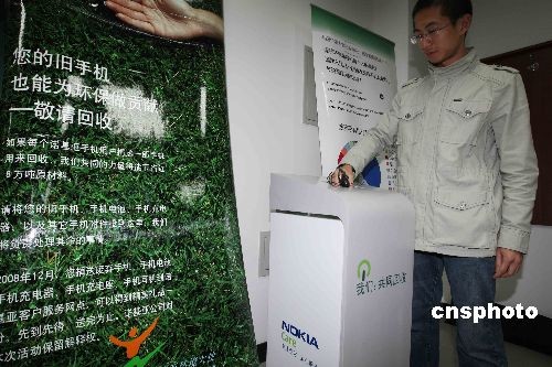 圖為大學(xué)生將手機(jī)等廢舊用品投入環(huán)保“綠箱子”。