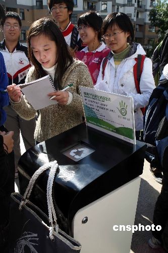 10月31日晚,由某環(huán)保企業(yè)率先發(fā)起的環(huán)!熬G箱子”進(jìn)校園活動(dòng)在中國傳媒大學(xué)、清華大學(xué)正式展開,此次活動(dòng)的目的在于喚起全民族的環(huán)保意識,讓每一位公民都為環(huán)保事業(yè)做力所能及的事情。中新社發(fā) 任海霞 攝