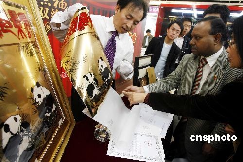 2008年10月28日,北京百萬莊圖書大廈,純金鑄造的熊貓國畫首次與觀眾見面,吸引了許多中外人駐足觀看。據(jù)了解,這幅金畫是以我國書畫大師吳作人的熊貓圖為藍本,用足金金箔為載體,按照1:1比例打造的。中新社發(fā) 郭鐵流 攝