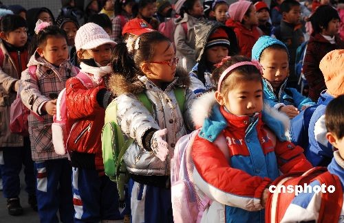 3月2日早,大連鵬輝小學(xué)的學(xué)生們?cè)诓賵?chǎng)列隊(duì)。當(dāng)日,寒假過后,遼寧大連市中小學(xué)2008-2009學(xué)年度第二學(xué)期開學(xué)上課。中新社發(fā) 劉德斌 攝