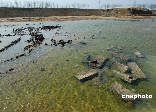 2009年3月25日,在京杭運(yùn)河山東臺兒莊段拍攝到的浮出水面的明朝古運(yùn)河船閘閘址。近日,一座在水下沉睡了400多年的古水工建筑遺址(古船閘)在京杭運(yùn)河臺兒莊段進(jìn)行河道疏浚工程時被發(fā)現(xiàn),這座古船閘位于新閘村北古運(yùn)河中心,船閘東西長約56米,南北約12米,古船閘的木樁繁多,條狀塊石可見,閘門樁基遺址清晰,據(jù)考證船閘修建于明朝萬歷年間,是明代泇運(yùn)河上的丁廟船閘,是棗莊段運(yùn)河(泇運(yùn)河)的八閘之一,距今400多年。此次古船閘的發(fā)現(xiàn),是繼頓莊船閘后的又一重大發(fā)現(xiàn),對古運(yùn)河棗莊段歷史和古水工建筑的研究具有非常重要的價值。中新社發(fā) 高啟民 攝