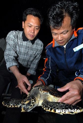 4月13日,福州一漁民將其幾天前在海邊偶然發(fā)現(xiàn)的“玳瑁”海龜送進福州左海海底世界。這只“玳!遍L約12厘米,重約1750克,嘴如鷹嘴,甲殼為褐色,頜緣鋸齒狀。據(jù)飼養(yǎng)員介紹,這只小海龜大約才2歲,還屬于“嬰兒”狀態(tài)。“玳!庇址Q十三鱗,屬于國家二級保護動物,一般壽命可達1500歲,成年的玳瑁(約20多歲)身長1米,體重40~60公斤,主要生長于熱帶及亞熱帶地區(qū)的暖水性海洋。該類海龜在中國主要分布于臺灣、福建和海南等沿海一帶海域。 中新社發(fā) 穆長梓 攝