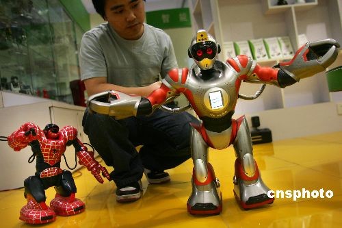 4月15日,北京首家機(jī)器人零售商店開業(yè)吸引顧客。該店位于中關(guān)村一電子商場(chǎng)內(nèi)。據(jù)該店羅經(jīng)理介紹,他們銷售的機(jī)器人有近百種,分為保潔型、娛樂型、教學(xué)型、家用型,價(jià)格從380元至58000元人民幣不等。保潔型機(jī)器人可每天定時(shí)清掃地面,自動(dòng)躲避障礙物。娛樂型包括有機(jī)器人寵物、會(huì)跳舞的機(jī)器人等。教學(xué)型機(jī)器人一般用于高校計(jì)算機(jī)編程方面的教學(xué)。家用型機(jī)器人相對(duì)高端,臉龐分析系統(tǒng)可將陌生人的面容發(fā)送到主人手機(jī)上,具有“看家”功能,還能通過無線終端設(shè)備監(jiān)測(cè)家里老人的血壓脈搏等,發(fā)現(xiàn)問題會(huì)通知主人。中新社發(fā) 富田 攝
