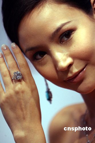名模Amamda Strang小姐展示15.01卡拉足色全美戒指。