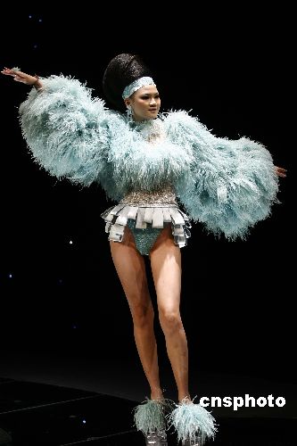 十一月三日晚,在北京舉行的2007年中國(guó)國(guó)際時(shí)裝周的舞臺(tái)上,模特在夢(mèng)幻般的舞臺(tái)上展示設(shè)計(jì)師華麗的作品。中新社發(fā) 盛佳鵬 攝