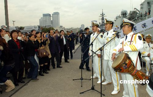 11月28日上午,中國(guó)海軍“深圳”號(hào)導(dǎo)彈驅(qū)逐艦抵達(dá)日本東京晴海碼頭,開(kāi)始對(duì)日本進(jìn)行正式友好訪問(wèn)。日方舉行了熱烈的歡迎儀式。歡迎儀式后,中日兩國(guó)軍樂(lè)隊(duì)開(kāi)始聯(lián)合演出。中新社發(fā) 滕劍峰 攝